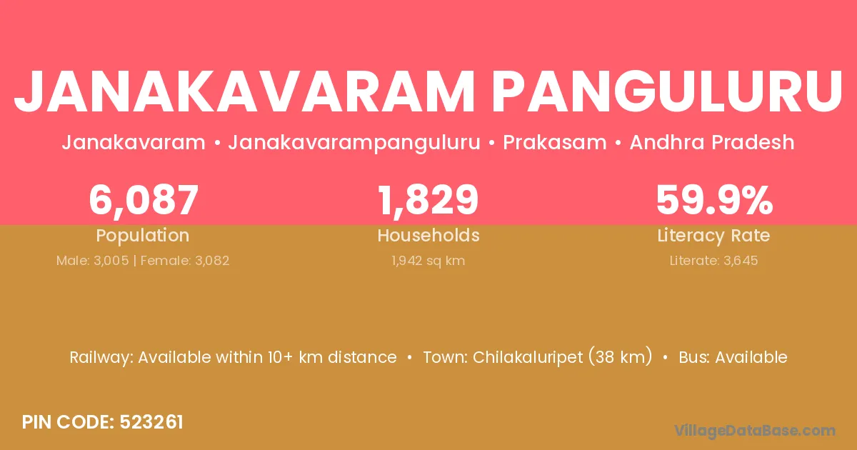 Janakavaram Panguluru village has a total population of 6,087 people, of which 3,005 are males and 3,082 are females.