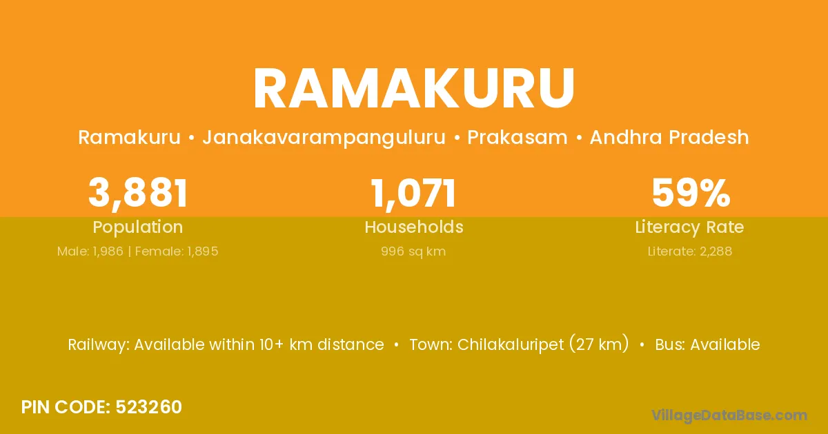 Ramakuru village has a total population of 3,881 people, of which 1,986 are males and 1,895 are females.