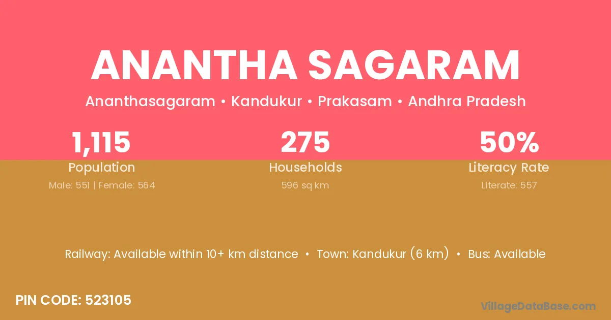 Anantha Sagaram village has a total population of 1,115 people, of which 551 are males and 564 are females.