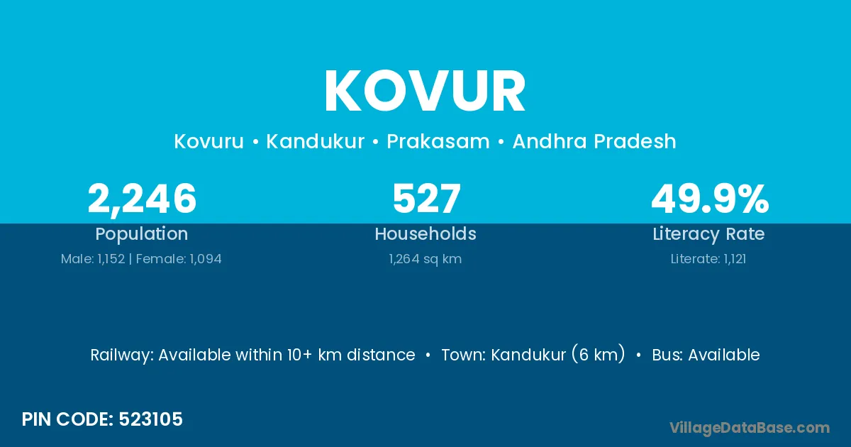 Kandukur (6 km) is the nearest town to Kovur village for major economic activities and is located approximately 6 km away.