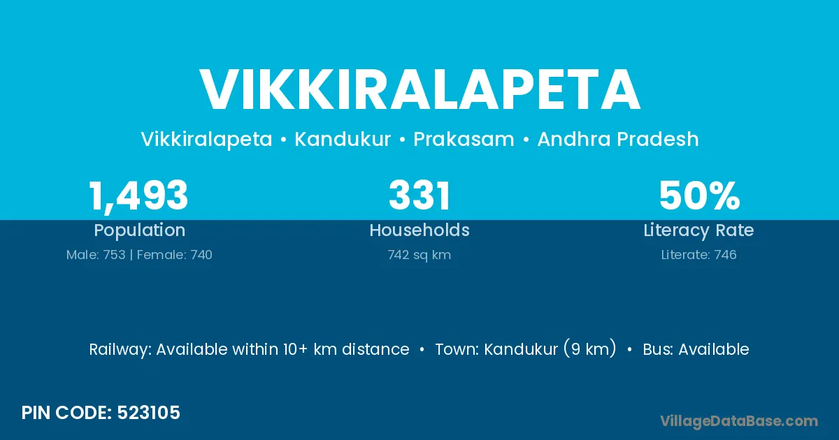 Kandukur (9 km) is the nearest town to Vikkiralapeta village for major economic activities and is located approximately 9 km away.