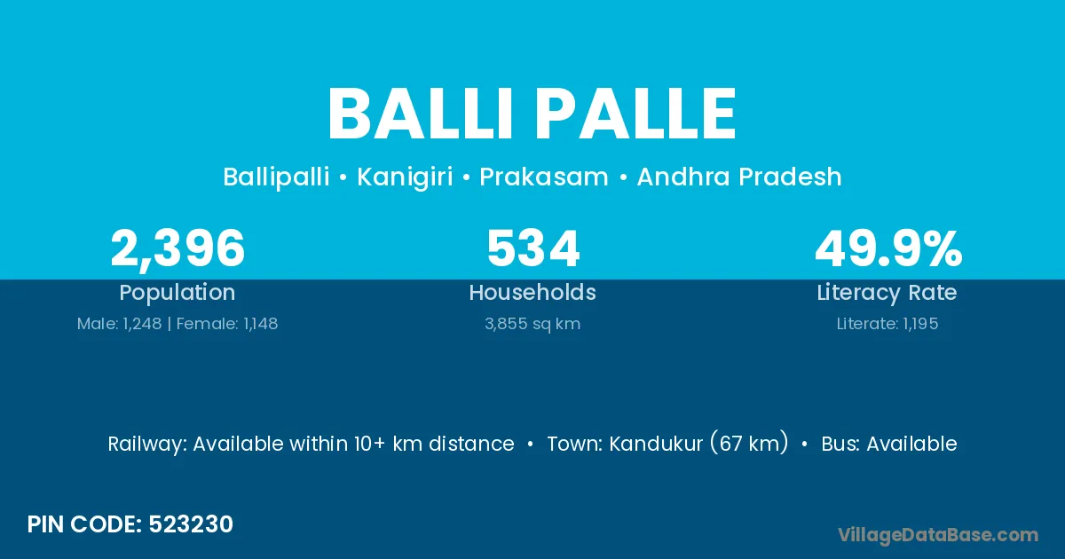 Kandukur (67 km) is the nearest town to Balli Palle village for major economic activities and is located approximately 67 km away.