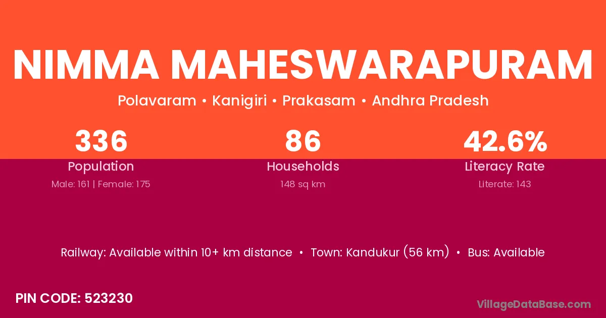 Kandukur (56 km) is the nearest town to Nimma Maheswarapuram village for major economic activities and is located approximately 56 km away.