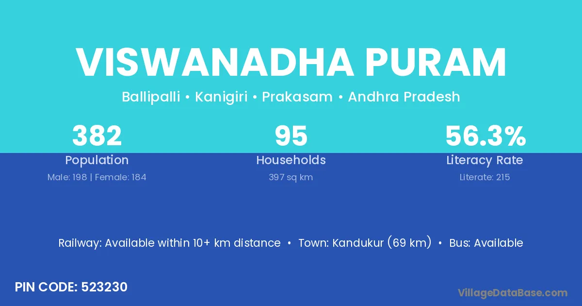 Kandukur (69 km) is the nearest town to Viswanadha Puram village for major economic activities and is located approximately 69 km away.