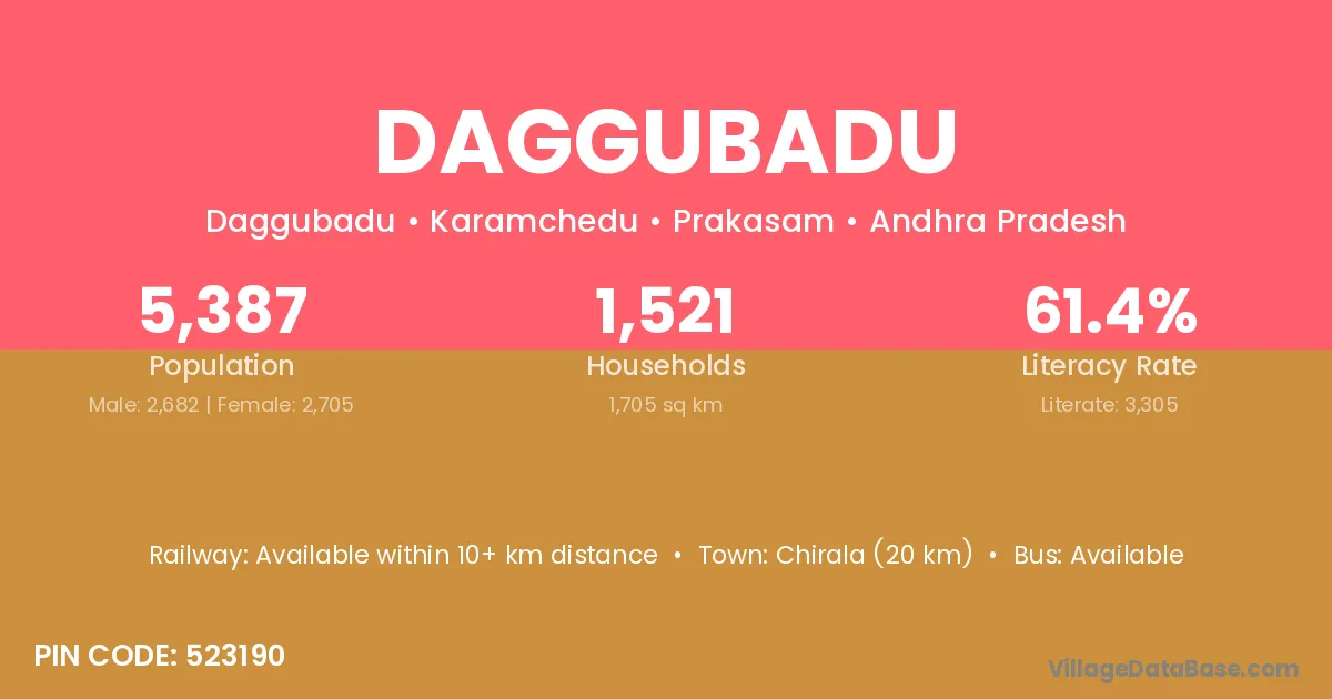 Chirala (20 km) is the nearest town to Daggubadu village for major economic activities and is located approximately 20 km away.