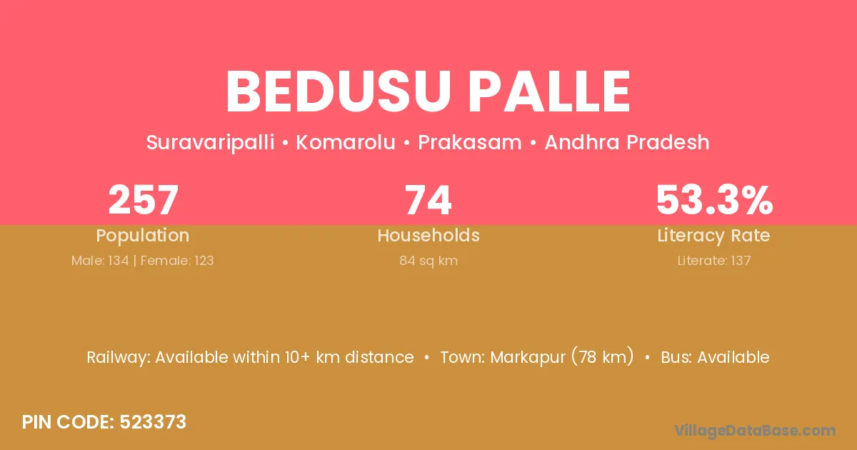 Markapur (78 km) is the nearest town to Bedusu Palle village for major economic activities and is located approximately 78 km away.