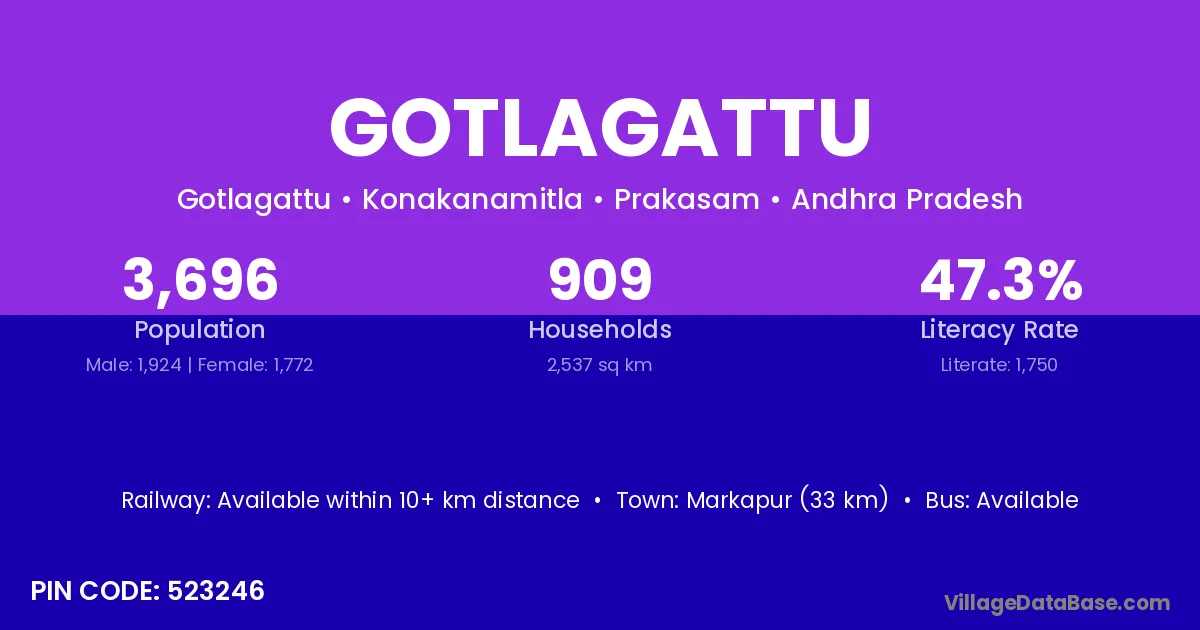 Markapur (33 km) is the nearest town to Gotlagattu village for major economic activities and is located approximately 33 km away.