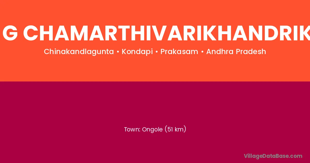 Ongole (51 km) is the nearest town to C G Chamarthivarikhandrika village for major economic activities and is located approximately 51 km away.