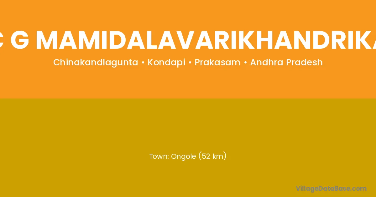 Ongole (52 km) is the nearest town to C G Mamidalavarikhandrika village for major economic activities and is located approximately 52 km away.