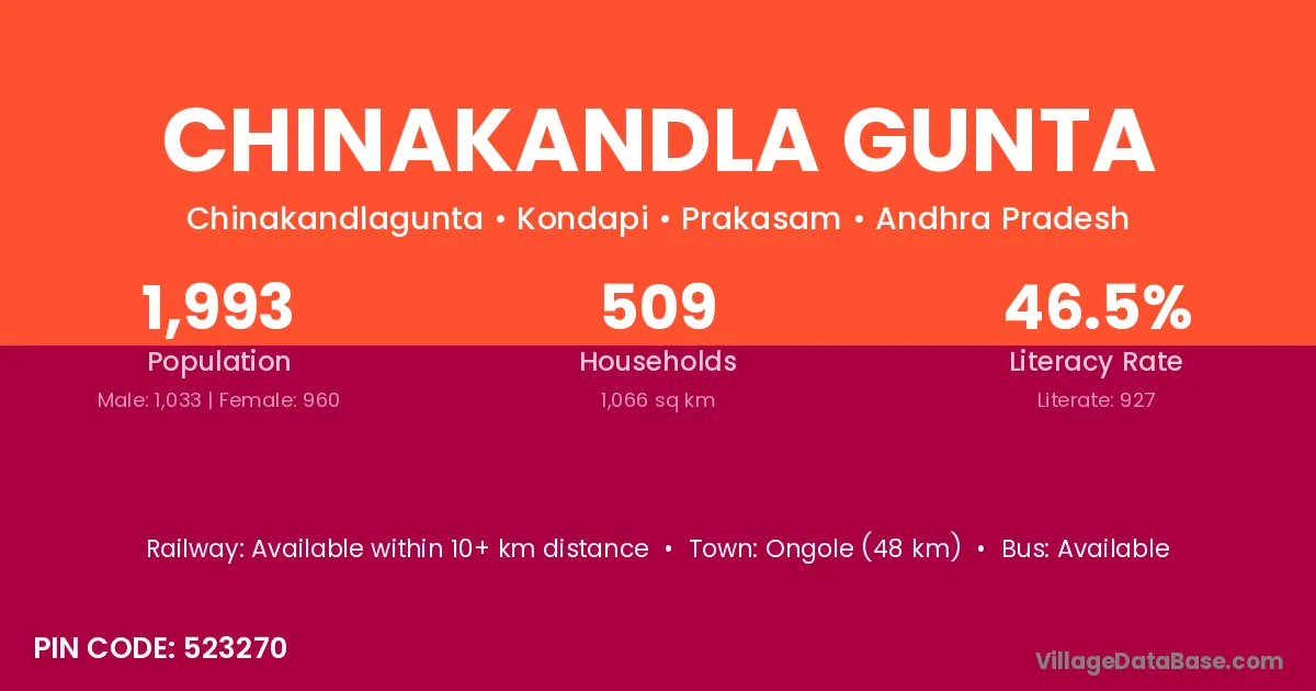Chinakandla Gunta village has a total population of 1,993 people, of which 1,033 are males and 960 are females.