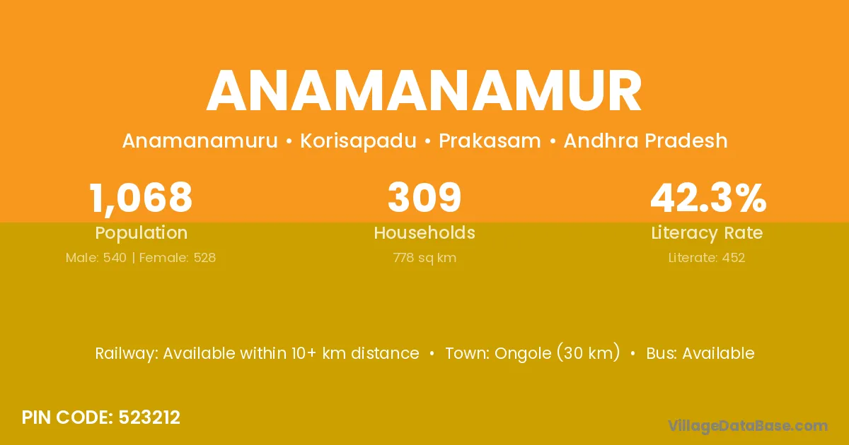 Ongole (30 km) is the nearest town to Anamanamur village for major economic activities and is located approximately 30 km away.