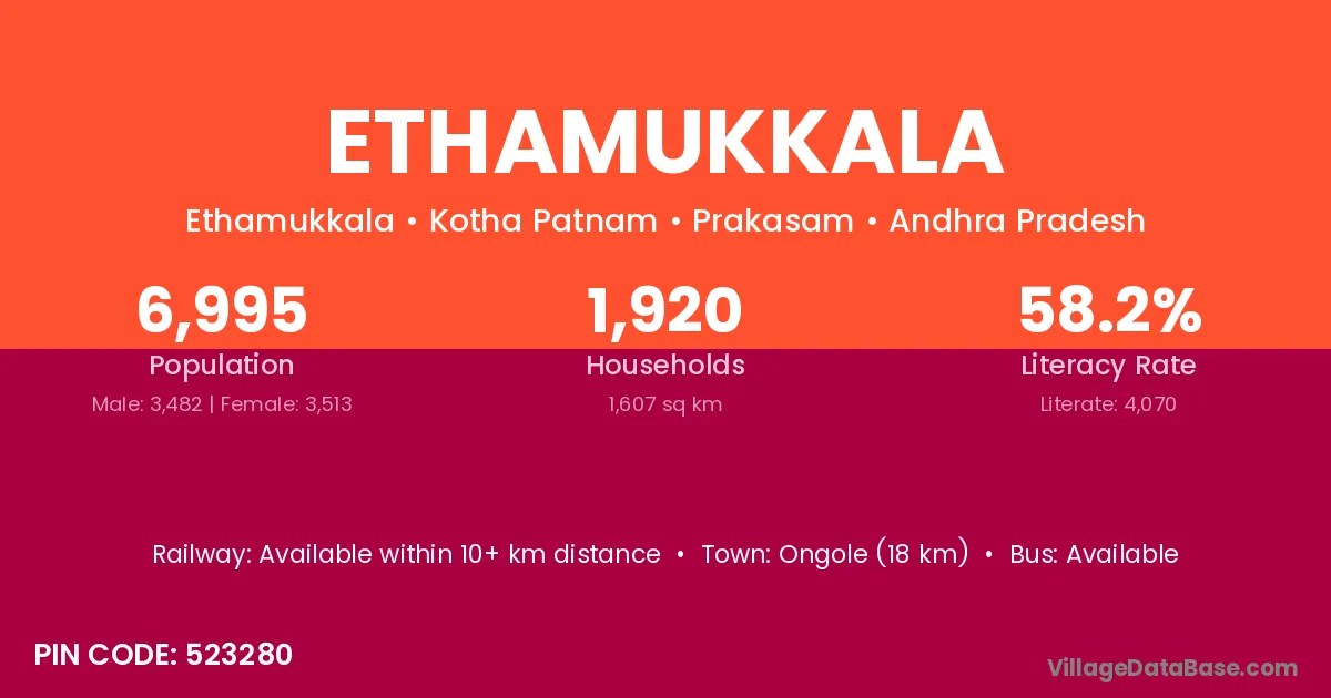 Ongole (18 km) is the nearest town to Ethamukkala village for major economic activities and is located approximately 18 km away.
