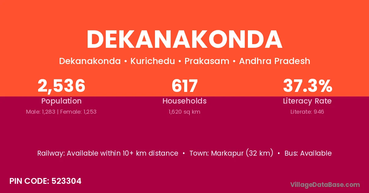 Markapur (32 km) is the nearest town to Dekanakonda village for major economic activities and is located approximately 32 km away.