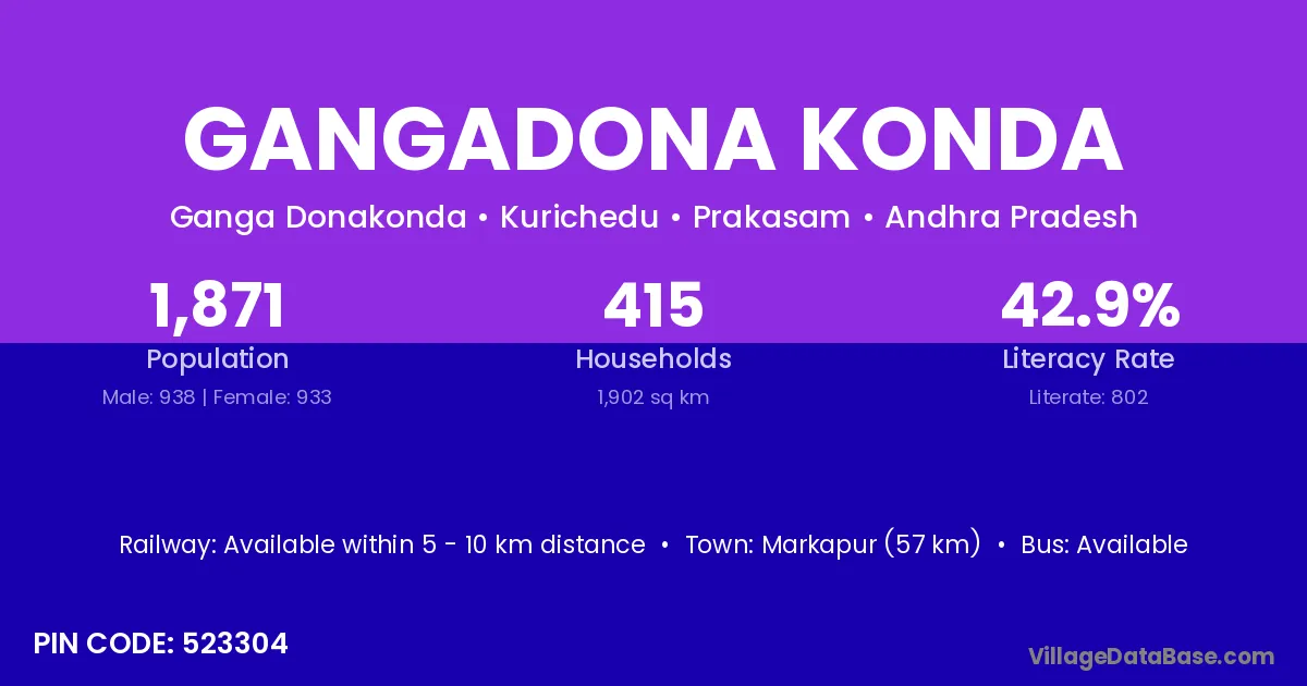 Markapur (57 km) is the nearest town to Gangadona Konda village for major economic activities and is located approximately 57 km away.