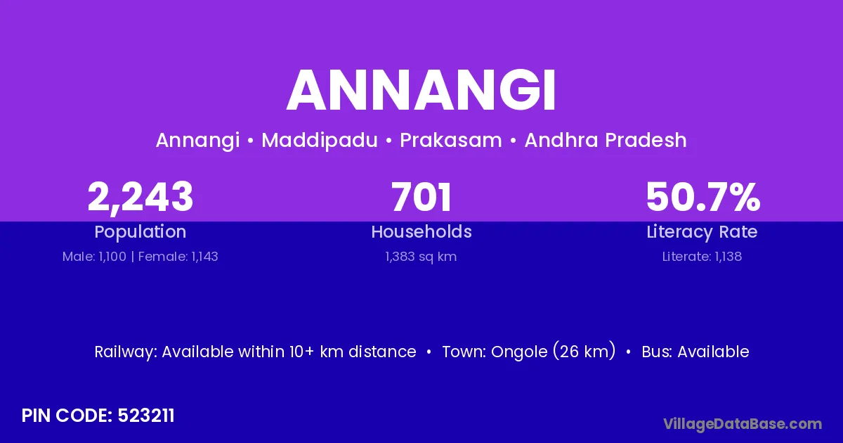 Ongole (26 km) is the nearest town to Annangi village for major economic activities and is located approximately 26 km away.
