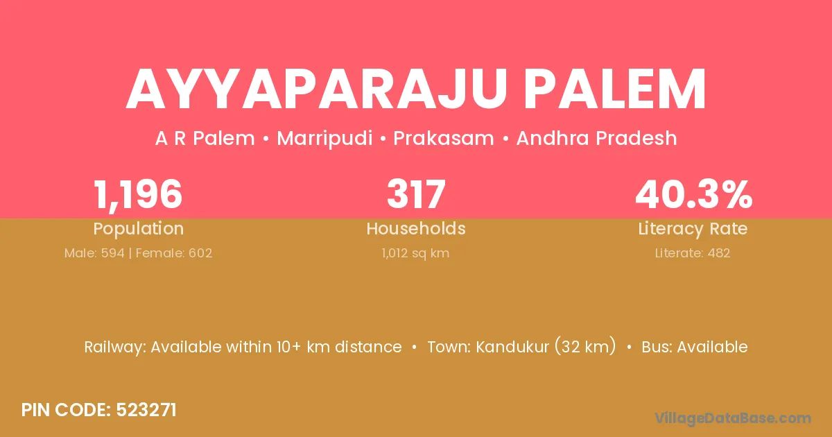 Ayyaparaju Palem village has a total population of 1,196 people, of which 594 are males and 602 are females.