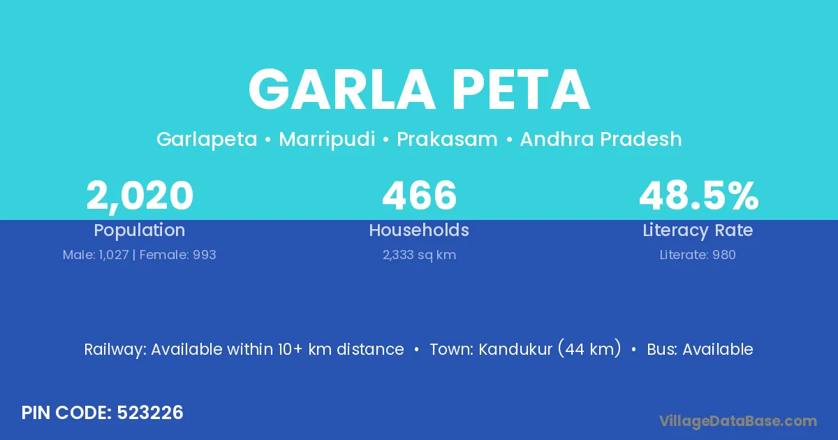 Kandukur (44 km) is the nearest town to Garla Peta village for major economic activities and is located approximately 44 km away.