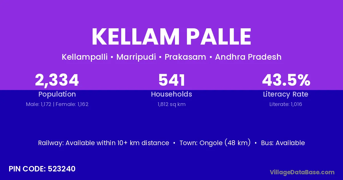 Ongole (48 km) is the nearest town to Kellam Palle village for major economic activities and is located approximately 48 km away.