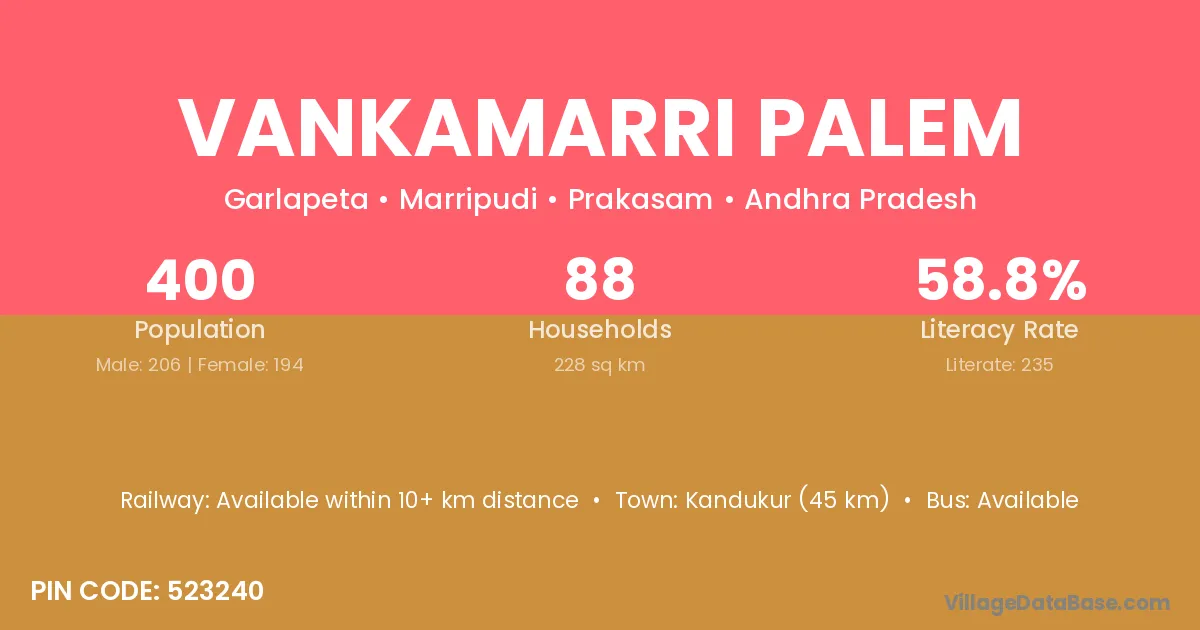 Vankamarri Palem village has a total population of 400 people, of which 206 are males and 194 are females.