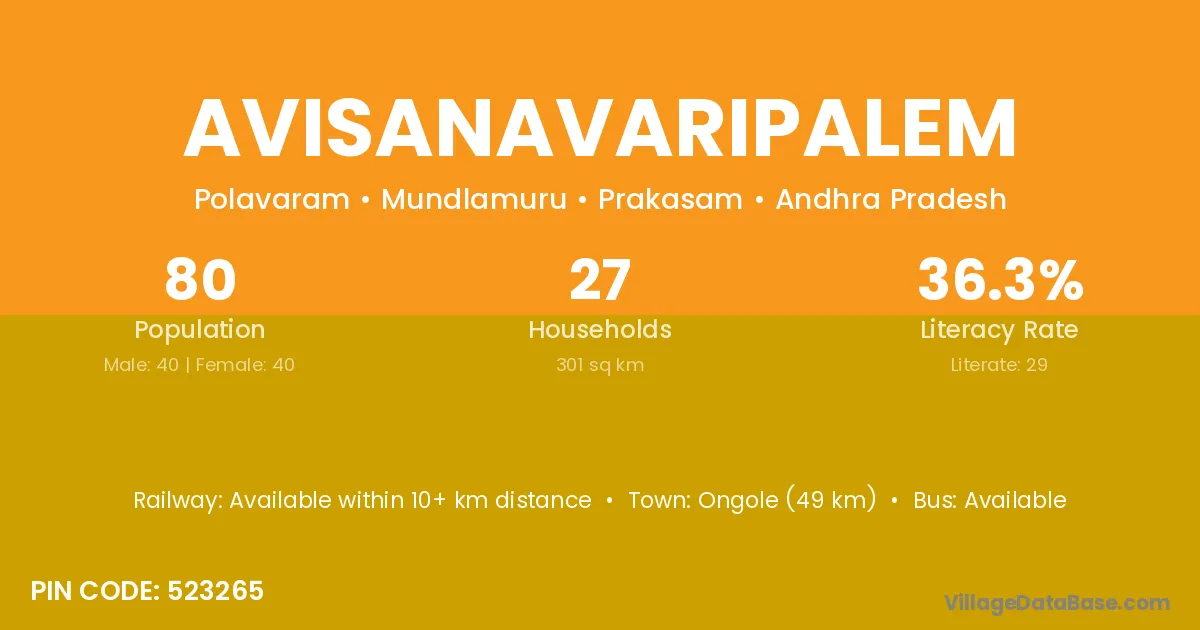 Avisanavaripalem village has a total population of 80 people, of which 40 are males and 40 are females.