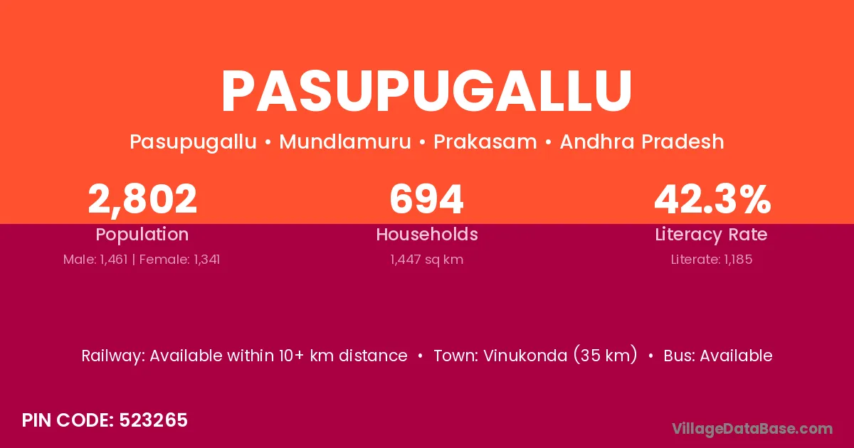 Vinukonda (35 km) is the nearest town to Pasupugallu village for major economic activities and is located approximately 35 km away.
