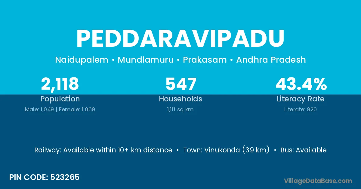 Peddaravipadu village has a total population of 2,118 people, of which 1,049 are males and 1,069 are females.