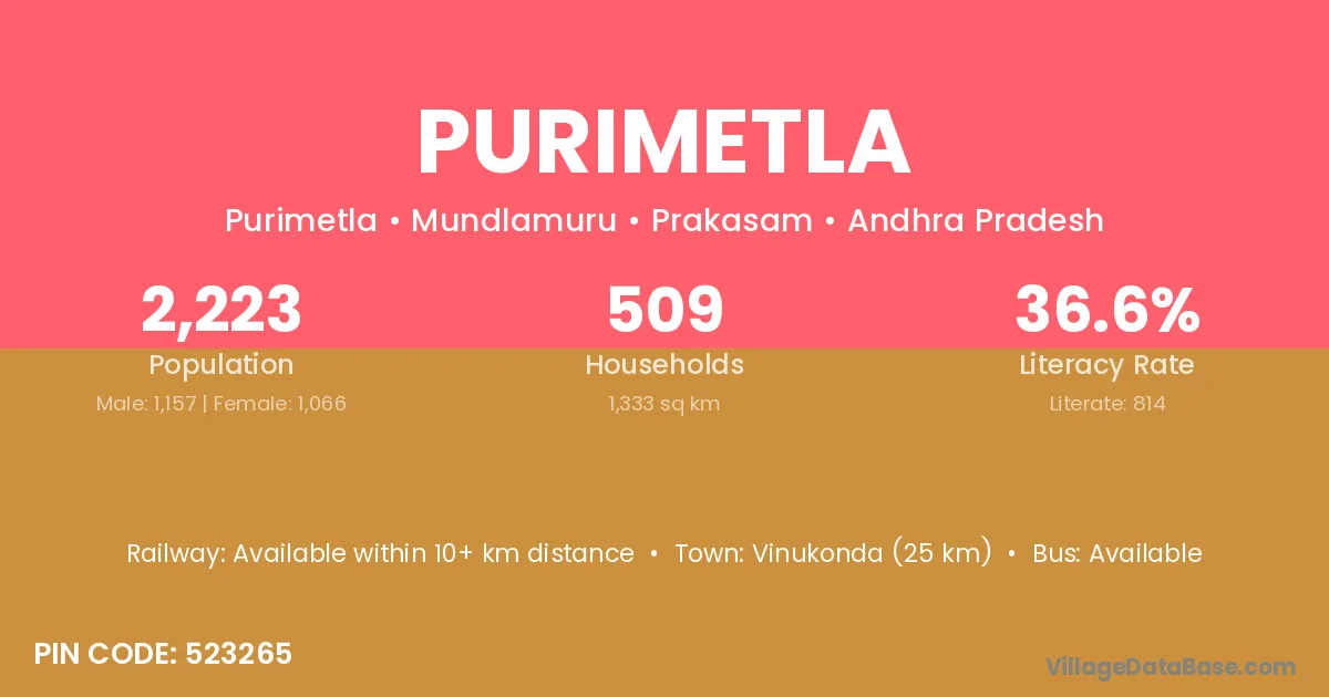 Purimetla village has a total population of 2,223 people, of which 1,157 are males and 1,066 are females.