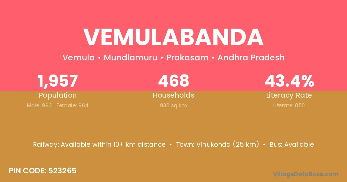 Vemulabanda village has a total population of 1,957 people, of which 993 are males and 964 are females.