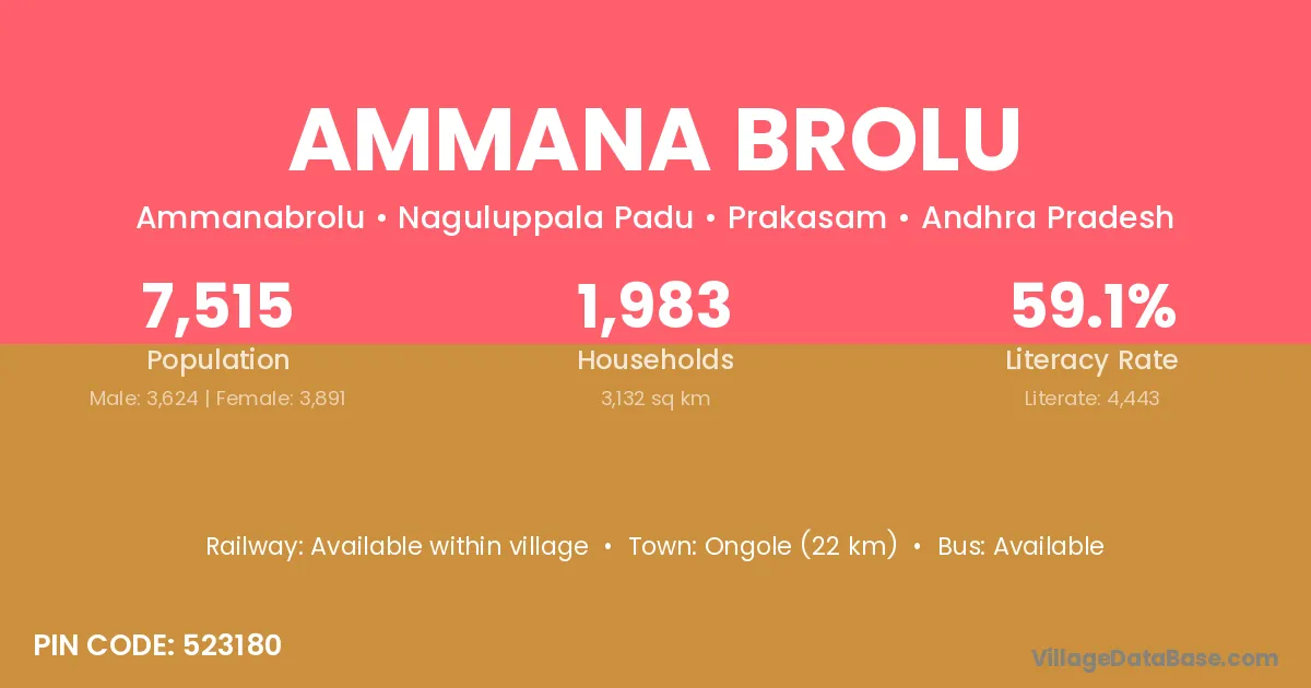 Ongole (22 km) is the nearest town to Ammana Brolu village for major economic activities and is located approximately 22 km away.