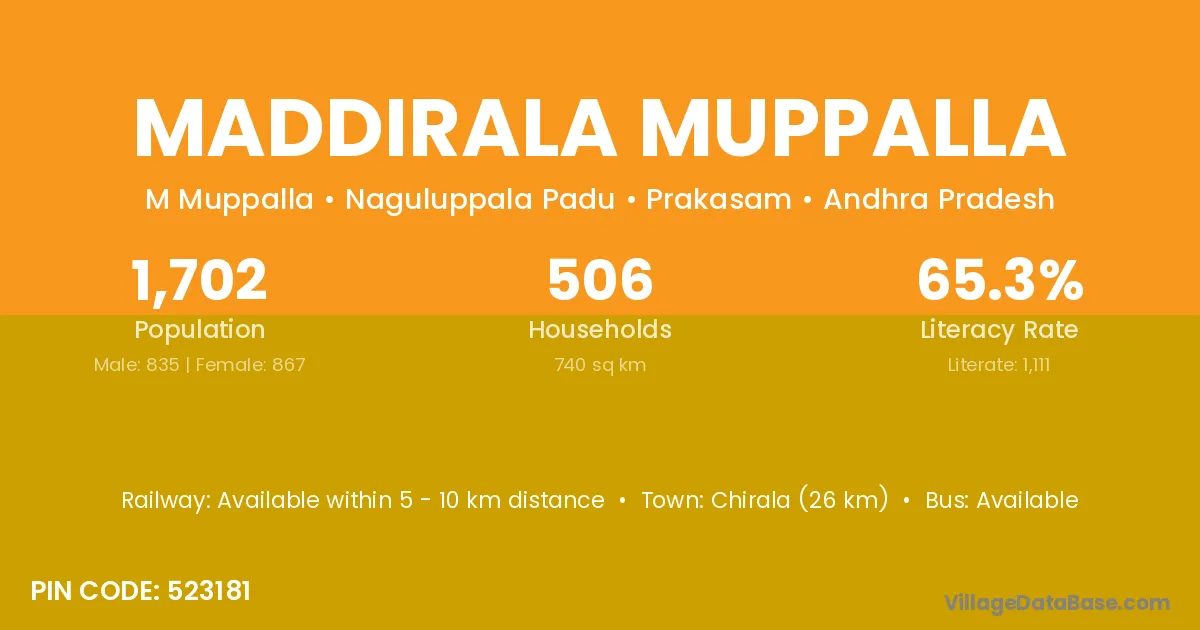 Chirala (26 km) is the nearest town to Maddirala Muppalla village for major economic activities and is located approximately 26 km away.