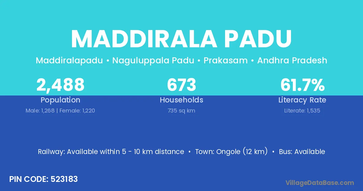 Ongole (12 km) is the nearest town to Maddirala Padu village for major economic activities and is located approximately 12 km away.