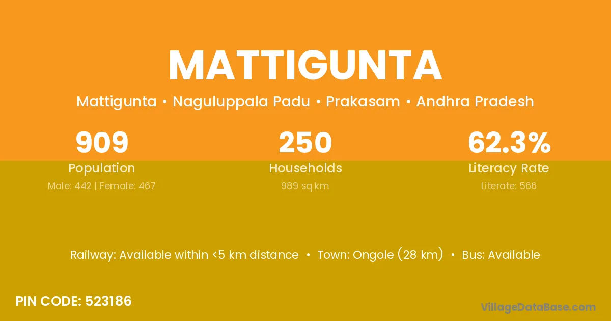 Ongole (28 km) is the nearest town to Mattigunta village for major economic activities and is located approximately 28 km away.