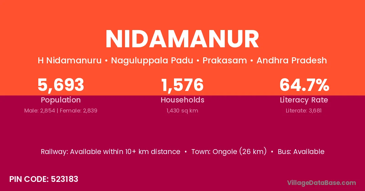Ongole (26 km) is the nearest town to Nidamanur village for major economic activities and is located approximately 26 km away.