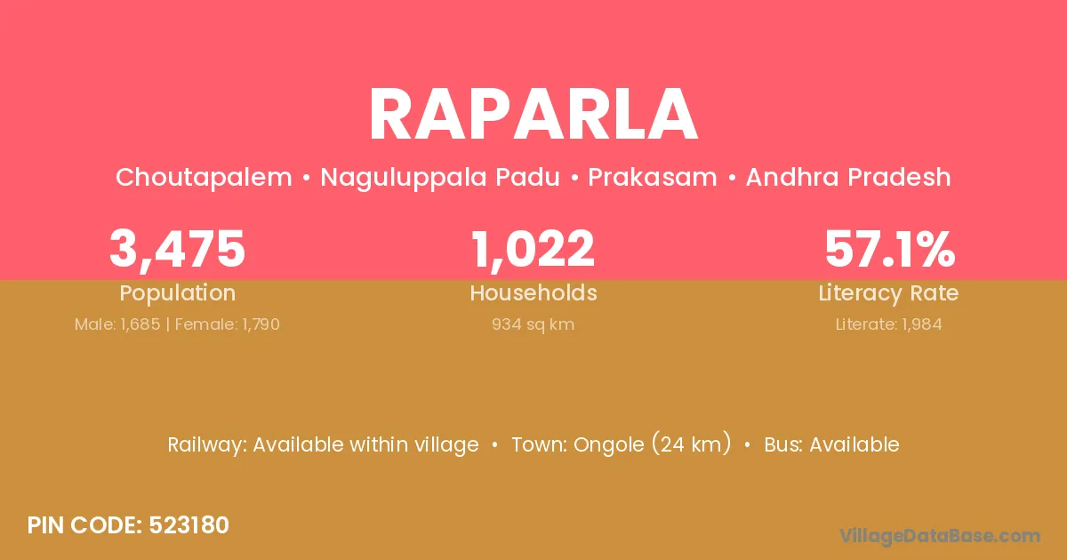 Ongole (24 km) is the nearest town to Raparla village for major economic activities and is located approximately 24 km away.