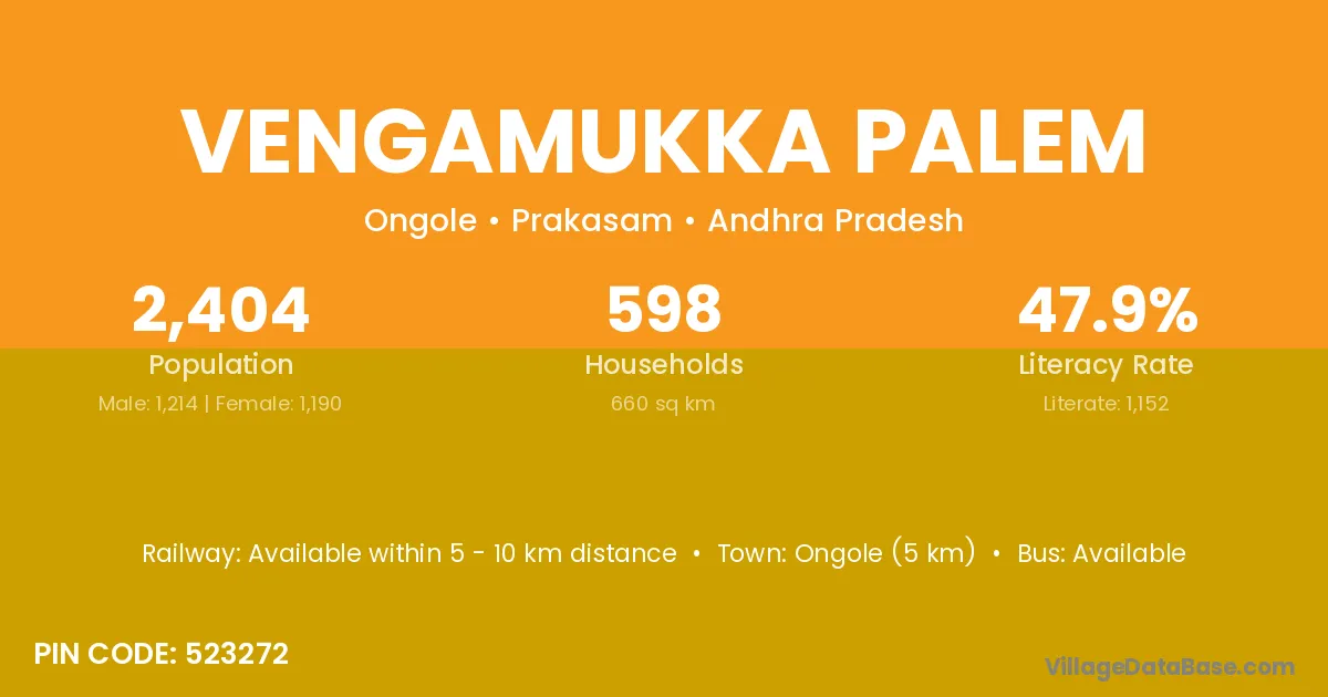Ongole (5 km) is the nearest town to Vengamukka Palem village for major economic activities and is located approximately 5 km away.