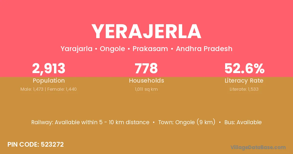 Ongole (9 km) is the nearest town to Yerajerla village for major economic activities and is located approximately 9 km away.