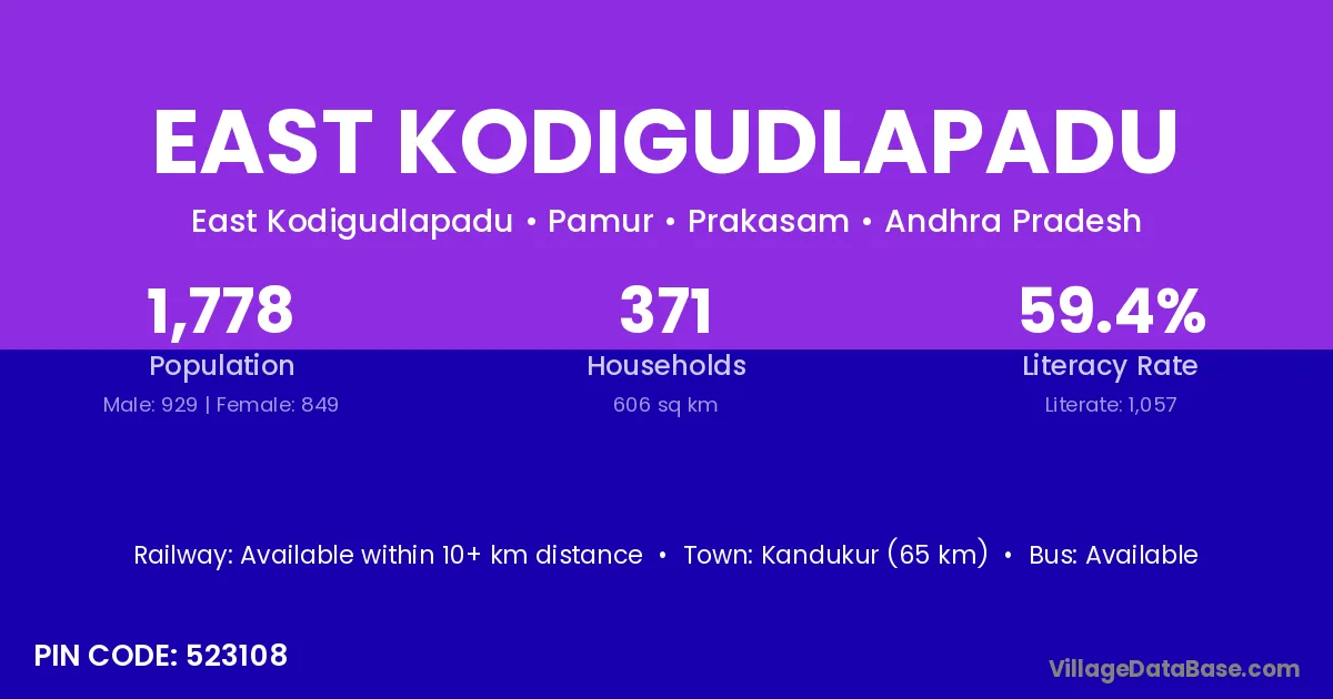 Kandukur (65 km) is the nearest town to East Kodigudlapadu village for major economic activities and is located approximately 65 km away.
