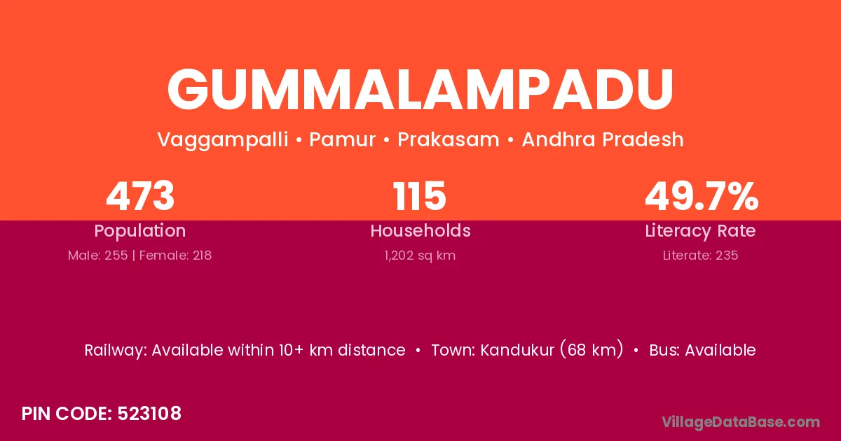 Gummalampadu village has a total population of 473 people, of which 255 are males and 218 are females.