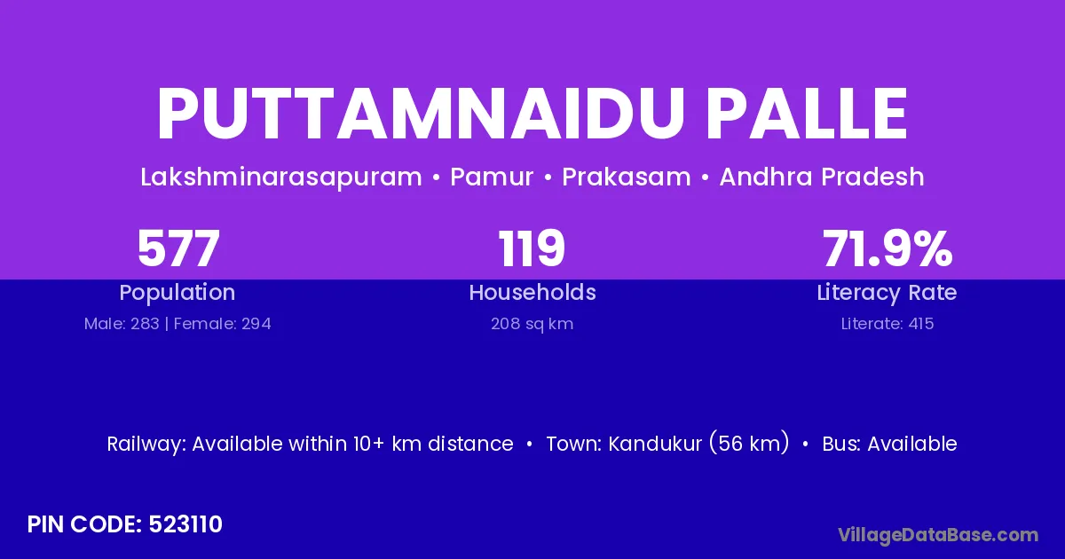 Kandukur (56 km) is the nearest town to Puttamnaidu Palle village for major economic activities and is located approximately 56 km away.