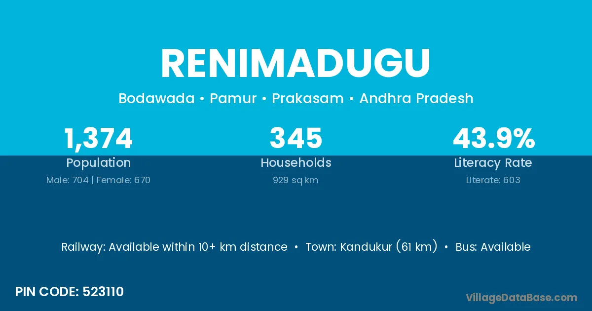 Kandukur (61 km) is the nearest town to Renimadugu village for major economic activities and is located approximately 61 km away.