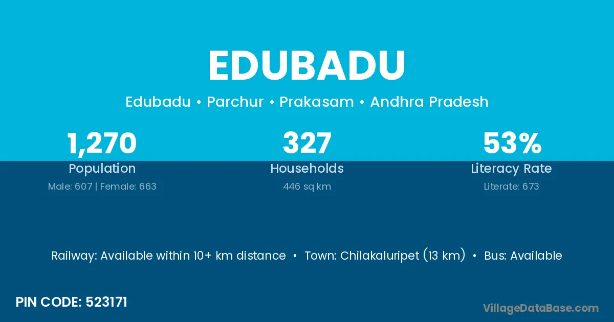 Chilakaluripet (13 km) is the nearest town to Edubadu village for major economic activities and is located approximately 13 km away.