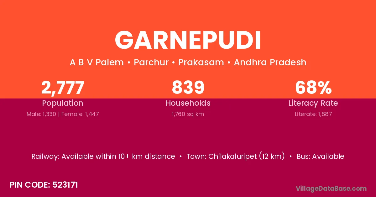 Chilakaluripet (12 km) is the nearest town to Garnepudi village for major economic activities and is located approximately 12 km away.