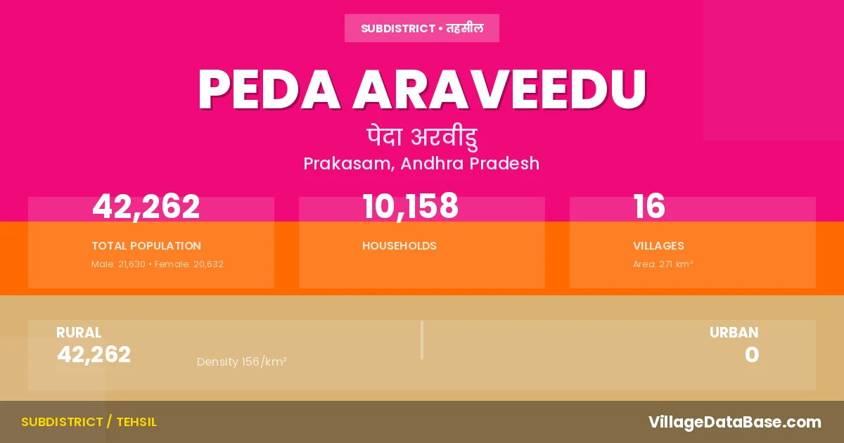 According to the 2011 census The total area of Peda Araveedu Mandal is 271 km², with a population of 42262 people. The population density is 156 inhabitants per square kilometre, and there are approximately 10158 houses in the sub district.