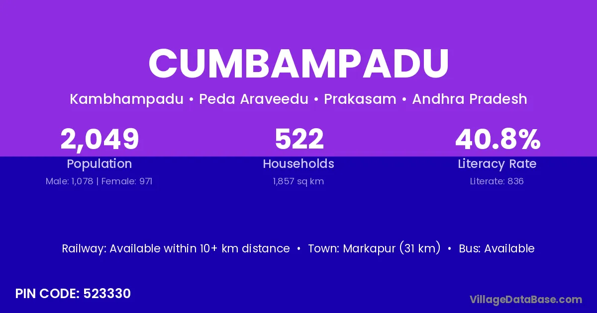 Cumbampadu village has a total population of 2,049 people, of which 1,078 are males and 971 are females.