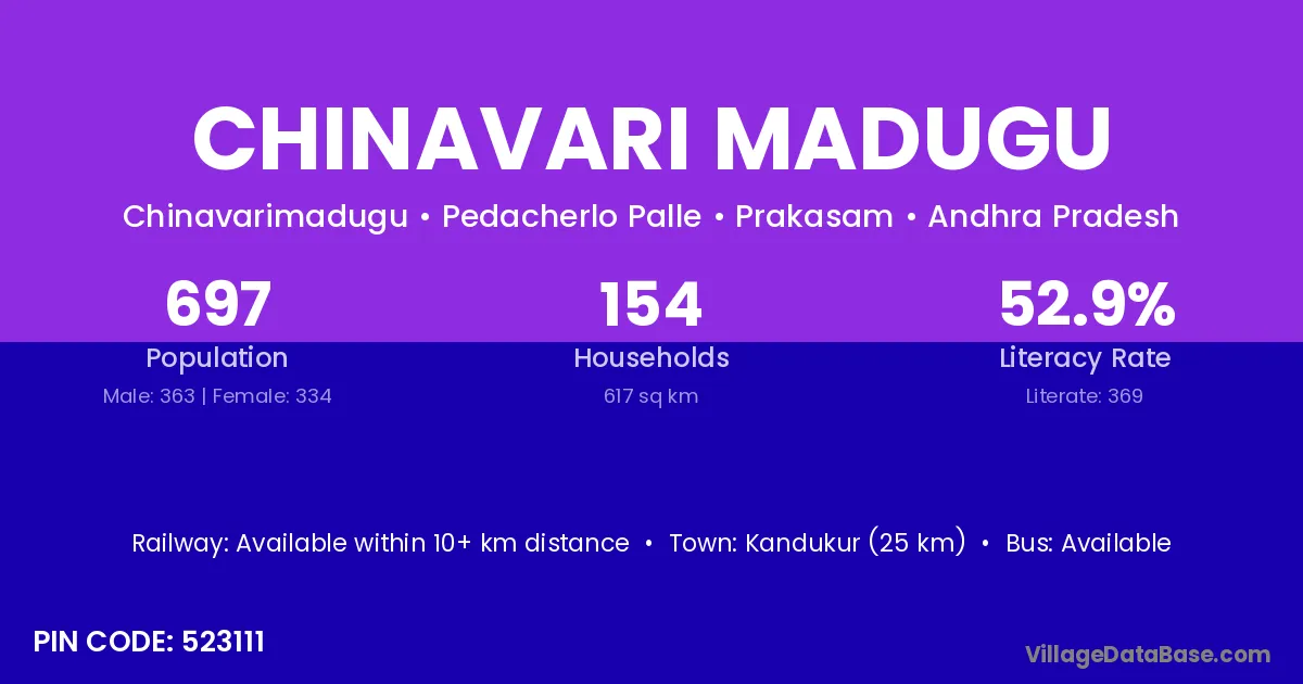 Kandukur (25 km) is the nearest town to Chinavari Madugu village for major economic activities and is located approximately 25 km away.