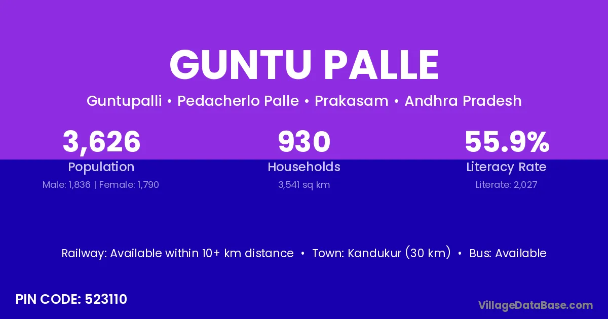 Kandukur (30 km) is the nearest town to Guntu Palle village for major economic activities and is located approximately 30 km away.