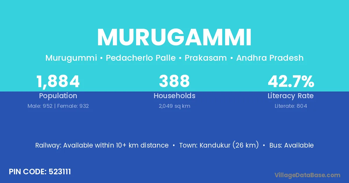 Kandukur (26 km) is the nearest town to Murugammi village for major economic activities and is located approximately 26 km away.