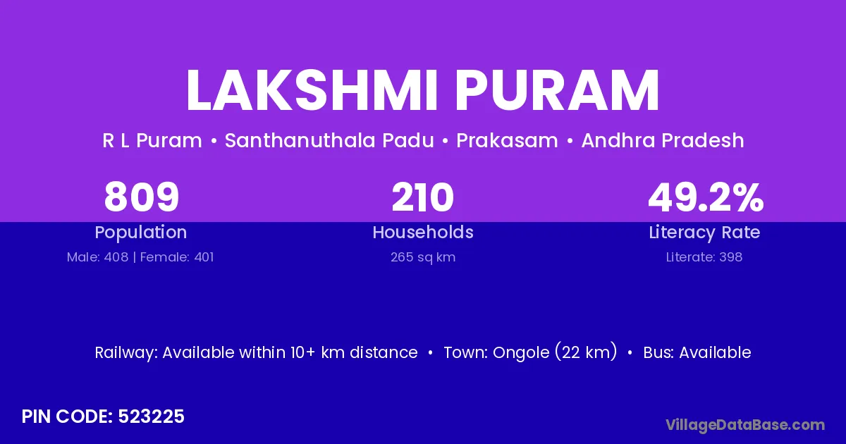 Ongole (42 km) is the nearest town to Lakshmi Puram village for major economic activities and is located approximately 42 km away.