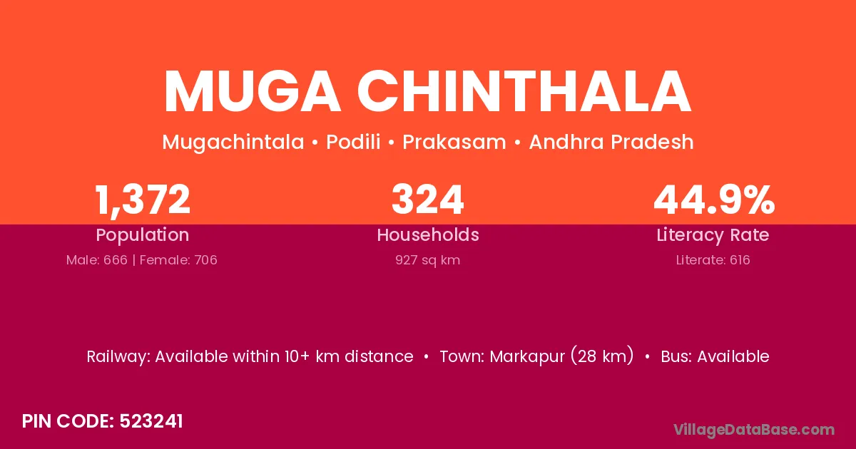 Markapur (28 km) is the nearest town to Muga Chinthala village for major economic activities and is located approximately 28 km away.