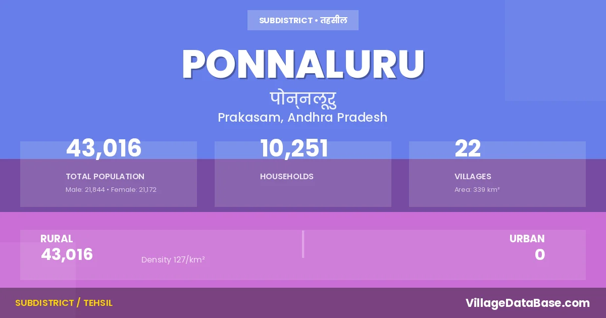 According to the 2011 census The total area of Ponnaluru Mandal is 339 km², with a population of 43016 people. The population density is 127 inhabitants per square kilometre, and there are approximately 10251 houses in the sub district.